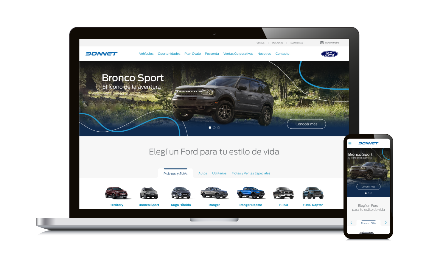 Para el diseño web el enfoque estuvo puesto en equilibrar la identidad visual corporativa de Ford con una propuesta que reflejara los valores de la empresa y su fuerte arraigo local. El resultado fue una experiencia clara, moderna y coherente con la marca, reforzando a la vez la cercanía y personalidad del concesionario.