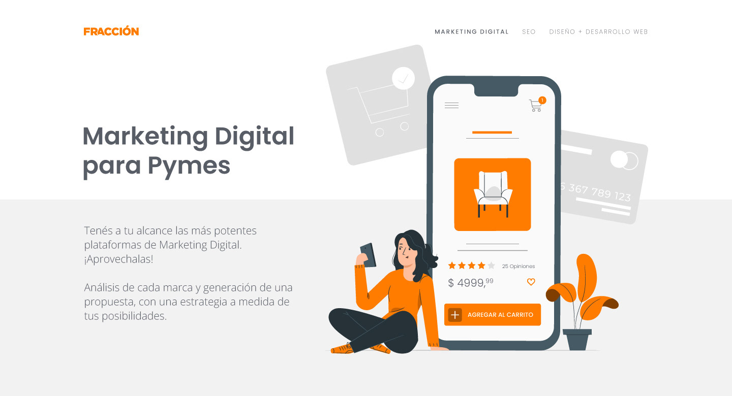 En Fracción desarrollé el diseño web —tanto para desktop como para mobile— de una empresa de marketing digital. La propuesta visual incorporó ilustraciones como elemento central para destacar las fortalezas y el valor de sus servicios. El trabajo se enfocó en construir una identidad moderna, dinámica y clara, reforzando la comunicación y mejorando la experiencia de quienes exploran la oferta de la marca.