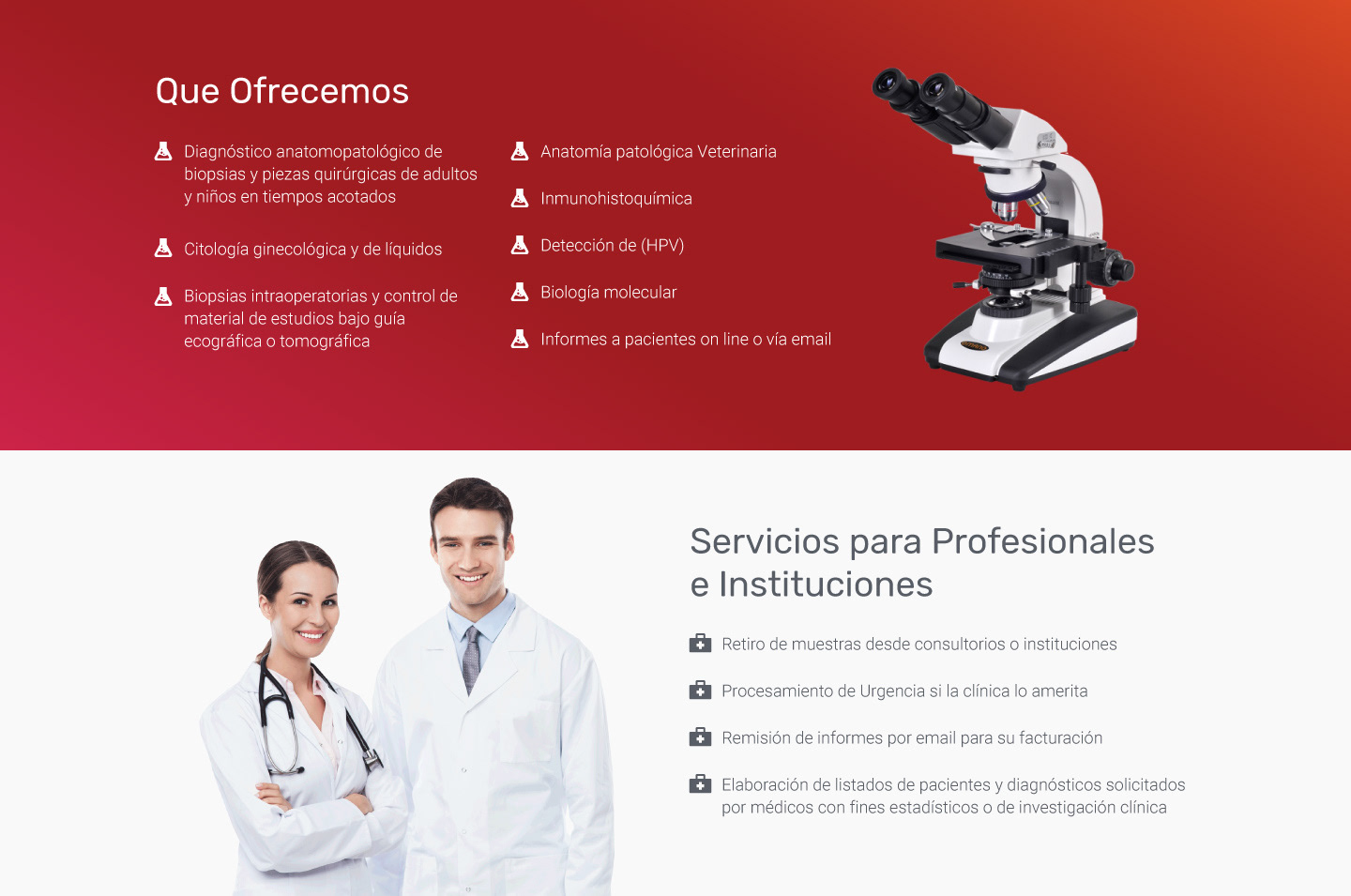 Diseñé la landing page de un laboratorio de patología, desarrollando una experiencia web para desktop y mobile orientada a ser la puerta de ingreso al sistema de resultados online. El enfoque se centró en una interfaz clara y accesible, que facilite el acceso rápido a los estudios y transmita confianza a los pacientes a través de una propuesta visual limpia y profesional.